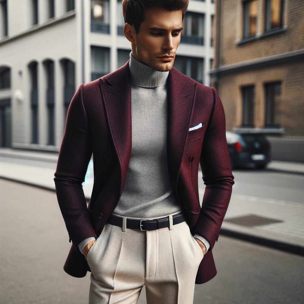 - Consider pairing a burgundy blazer with a light gray turtleneck and cream trousers for a look that is both refined and approachable. This ensemble works well for dinner dates or evening events.